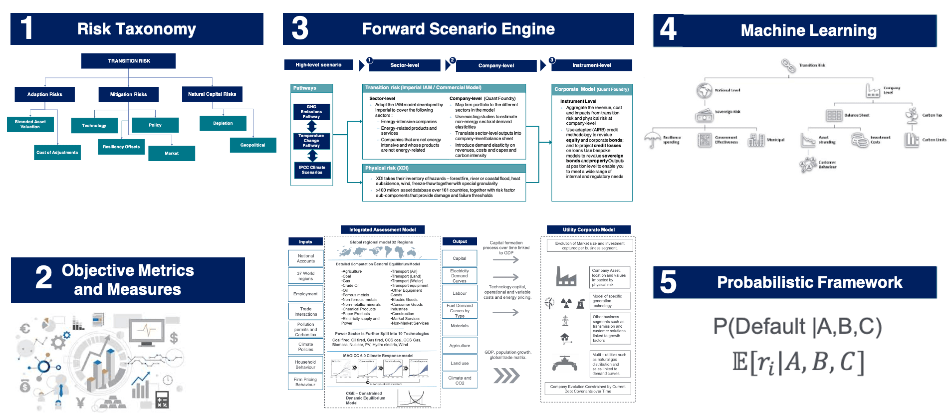 Quant Foundry has developed a Climate Change Credit model (QF4CM) based on its exclusive relationship with Imperial College London’s Integrated Assessment models (IAM). By integrating the IAM with QF credit capabilities, the full solution’s unique feature is that the model simulates from the bottom-up each company’s balance sheet based on a top-down restricted economy.